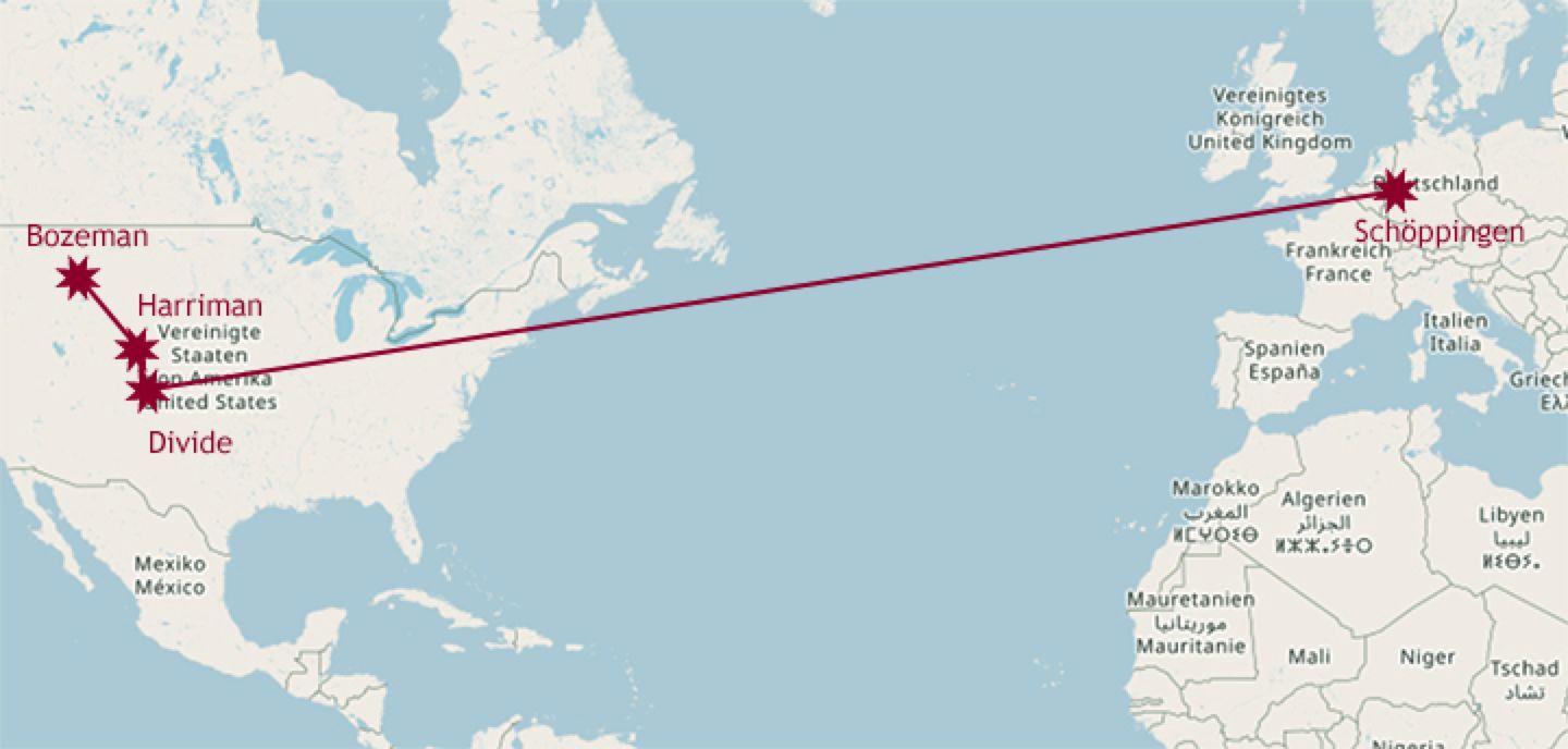 Die Startperson übergibt die Box an einen Amerikaner, der Ende des Jahres in die USA fliegen wird und sogar schon mal durch Bozeman gefahren ist.