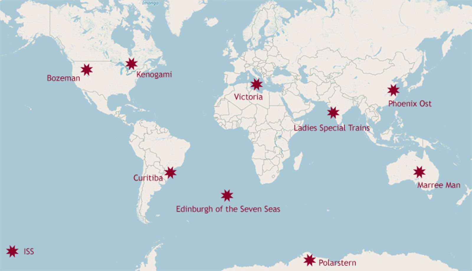 Alle 10 Zielorte sind Orte, die mit der Künstlerin zu tun haben. Es handelt sich um Orte, die mit ihrer Biographie verknüpft sind, um Orte, die bestimmte Aspekte ihrer Persönlichkeit repräsentieren und um Orte, an die sie gerne selbst reisen würde, um Aufnahmen zu machen.